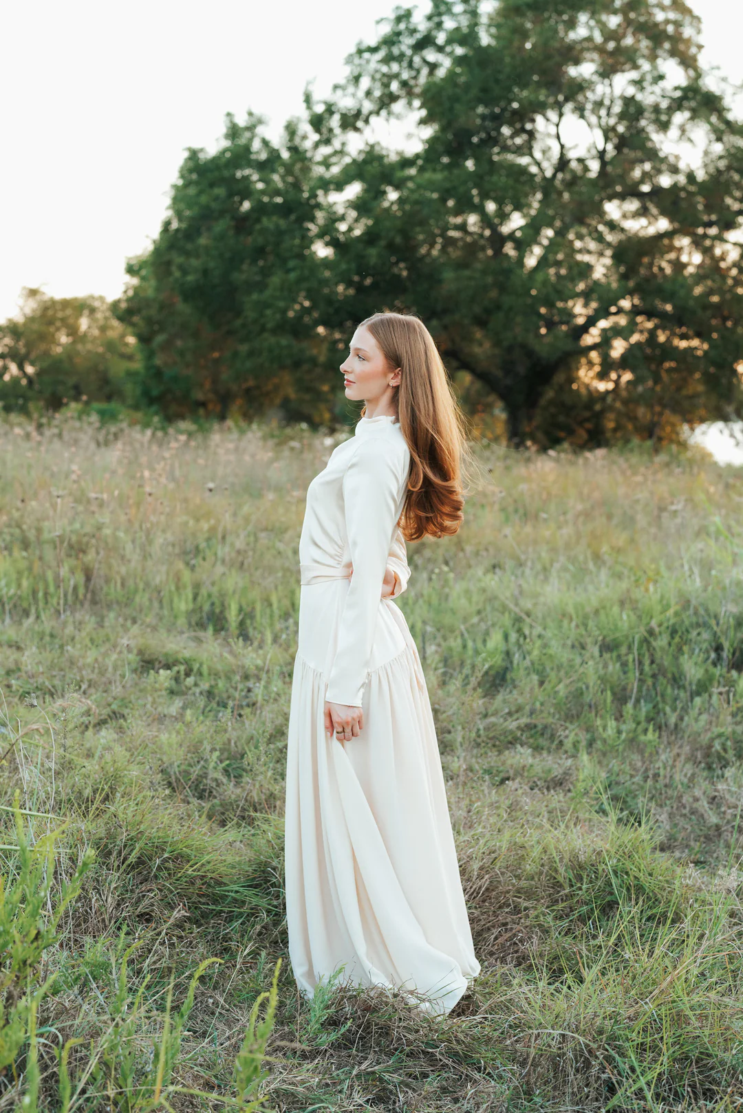 An asymmetric drop waist dress in a rich cream color, perfect for special occasions! It is an elegant and refined dress featuring a tailored satin bodice and flowing georgette skirt.Ā